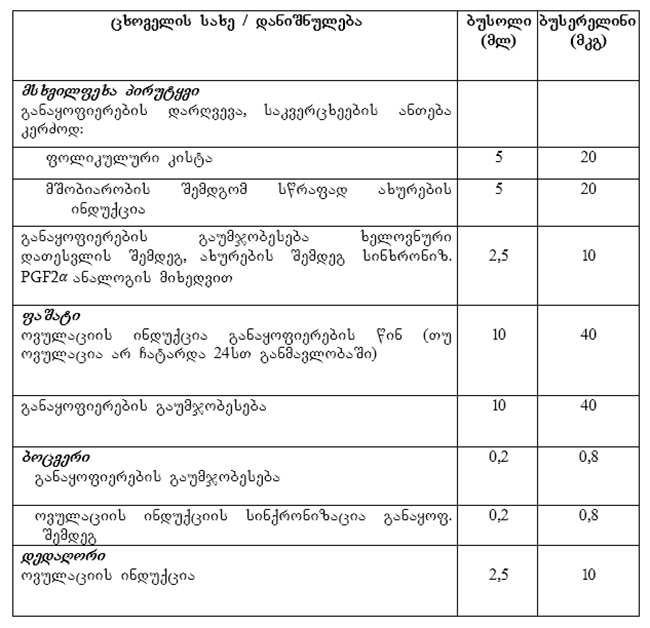 მსხვილფეხა პირუტყვს და ღორს: 10-20მკგ ბუსერელინი ერთ სულზე